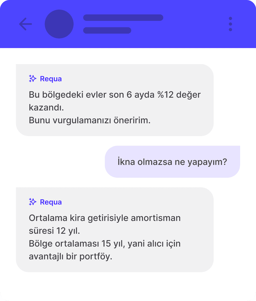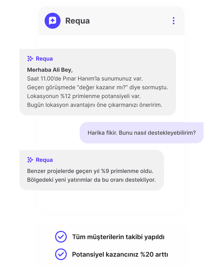 Requa, alıcı - satıcı - portföy eşleştirmesini otomatik olarak gerçekleştirir ve ilan dahil oluşturmadan süreci hızlıca kapatmanızı sağlar.