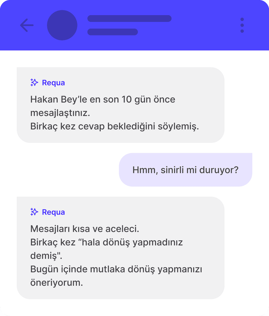 WhatsApp Business'ınızdaki müşteri mesajlarını analiz ederek sizin yerinize müşteri takibi yapar, gününüzü planlar ve her görüşmeyi satışa çevirmenizi sağlar.